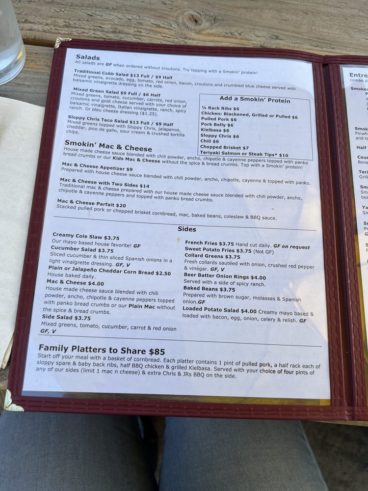Start off your meal with a basket of cornbread. Each platter contains 1 lb. pulled pork, a half rack each of sloppy spare and baby back ribs, half BBQ chicken and grilled Kielbasa. Served with your choice of four pints of any of our sides (limit 1 mac n cheese)