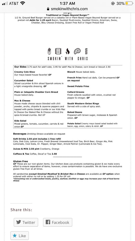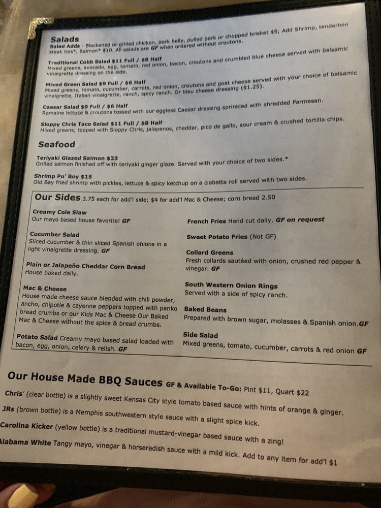 A full or half rack of smoked spare ribs slathered in Chris BBQ sauce. Gluten free.